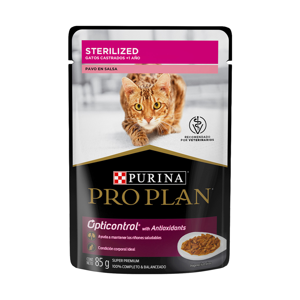 El alimento húmedo sterilized de pavo en trozos con salsa, es un alimento húmedo que combina la nutrición que tu deseas con el sabor que a ellos les encanta. Un alimento 100% completo y balanceado, con deliciosos trozos en salsa y beneficios nutricionales únicos para los gatos esterilizados. Contiene opticontrol con antioxidantes para ayudar a mantener riñones saludables y una condición corporal idónea.